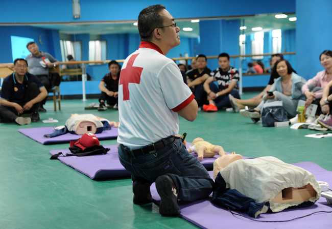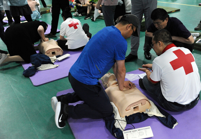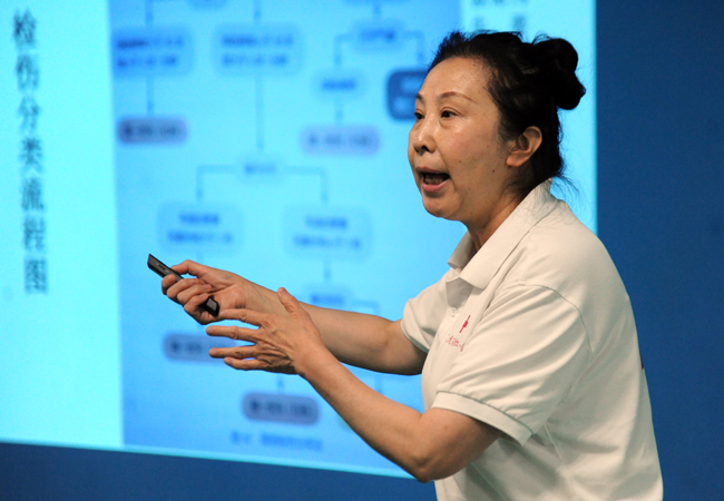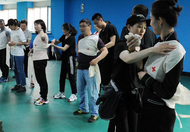 培训中,谭志强老师首先为学员们介绍了红十字运动的起源、组成、标志、基本原则等知识,讲解了应急救护的目的和原则、红十字救护员、应急救护的程序、注意事项等理论,随后进行了心肺复试(CPR)的基础知识、基本技术、现场操作程序、除颤器(AED)的使用等应急救护的学习,重点强调了生存链、“黄金4分钟”等知识点。陈杰老师带领大家学习了创伤出血与止血、现场包扎技术等创伤救护的知识、技能,重点进行了三角巾和绷带使用方法的实操演练。培训中教师们还介绍了常见急症、意外伤害和突发事件等方面的救护知识和处理办法,如:遇到气道异物梗阻、晕厥、癫痫、烧烫伤、淹溺、地震等怎样进行应急救护。本次培训运用多媒体,有视频,有演示,有案例,有互动,有实操,深深吸引了学员的注意力和学习兴趣。在实践练习过程中,教师要求严格、耐心指导,学员态度端正、学习认真,取得了良好的教学效果。最后,全体学员参加了救护理论、CPR操作技术、三角巾和绷带的止血包扎等多项内容的考核。