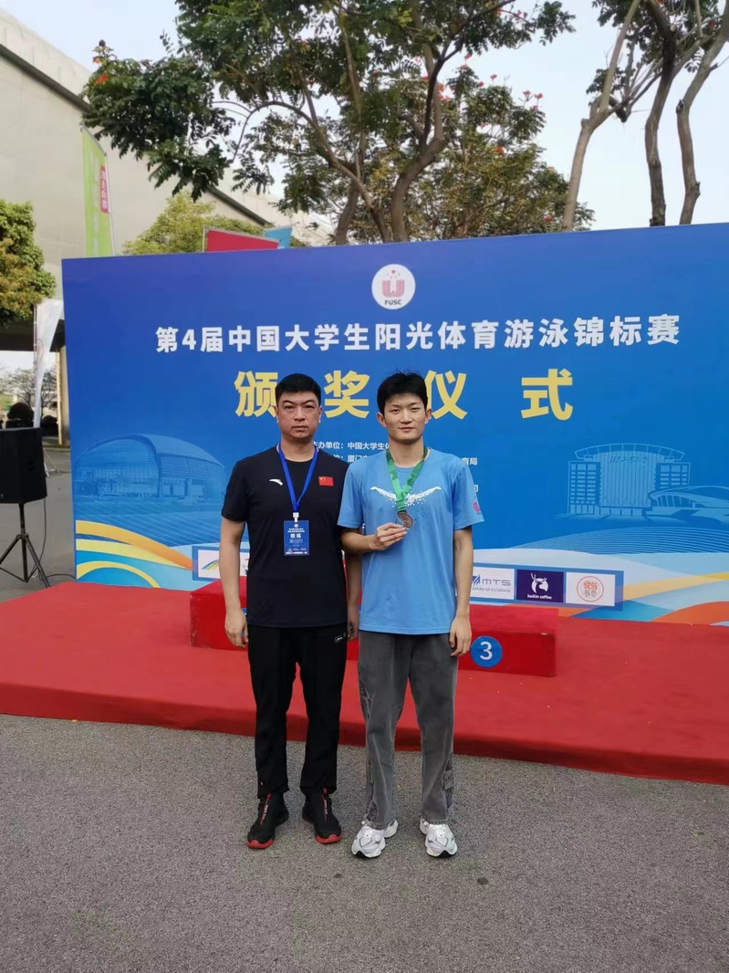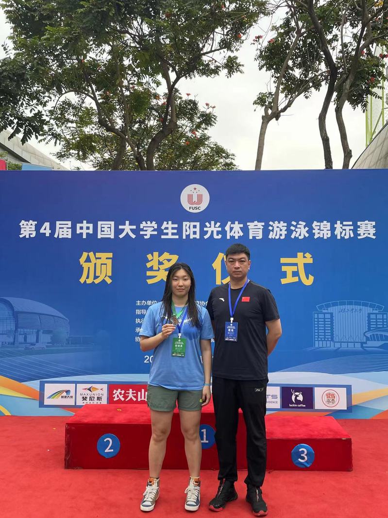 在本次比赛中,数学学院李沁轩同学获得男子甲组50米蛙泳铜牌,100米蛙泳第六名。 外国语学院沈星玄同学预赛中打破全国大学生阳光组女子100米蝶泳纪录,决赛获得铜牌,50米蝶泳获得铜牌。五名学生代表在各自项目的小组预赛中均获得前三名的好成绩。