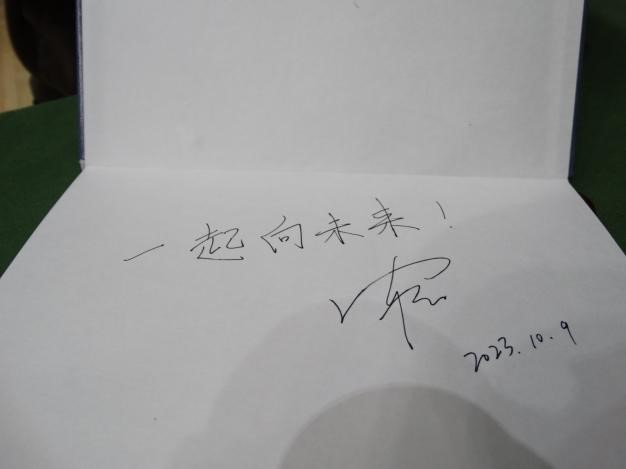 交流结束后,环境学子为老师们赠送了学院吉祥物公仔,感谢三位老师的指导。同时,陈金老师也热情地与同学们合照签名,并为环境学院送出寄语“一起向未来!”。