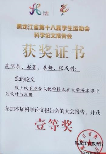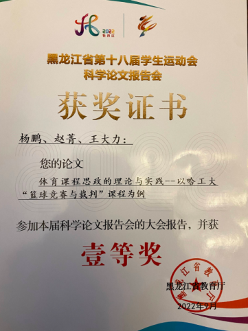 (二)积极提升科研能力,赋能tyc7111cc太阳成集团高质量发展。蒋强主持完成黑龙江省高等教育教改课题《“双一流”高校篮球及篮球裁判课融合式教学实践与探究》工作,等待验收;张宝军作为第一作者撰写的论文《“双一流”背景下高校公共体育课程建设现状的调查研究》、高宝泉作为第一作者撰写的论文《线上线下混合式教学模式在大学游泳课中的设计与应用》、杨鹏作为第一作者撰写的论文《体育课程思政的理论与实践--以哈工大“篮球竞赛与裁判”课程为例》在第十八届省学运会科学论文报告会上均获得一等奖;王剑虹和韩秀华老师分别参编著作两部。