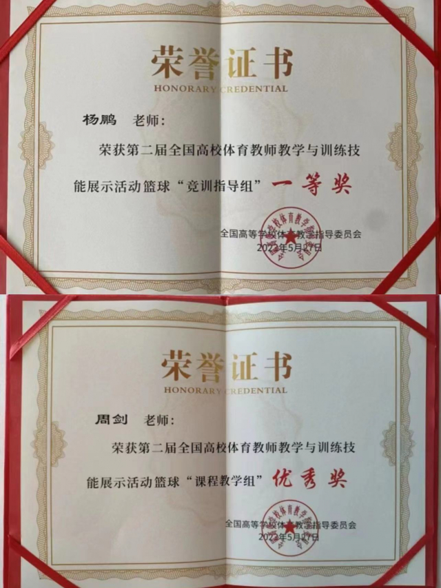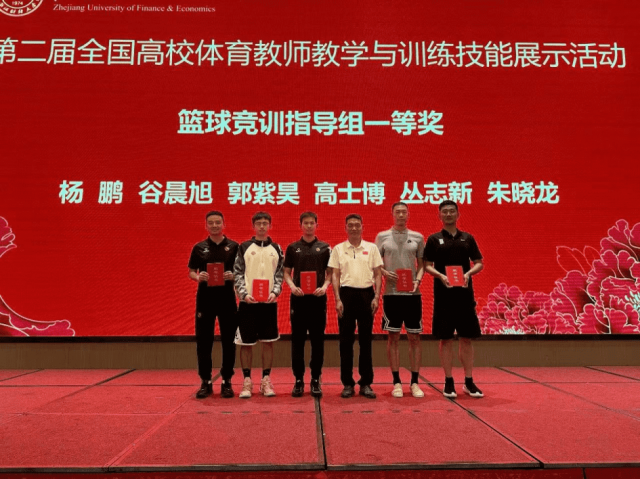 由教育部全国高等学校体育教学指导委员会组织的第二届全国高校体育教师教学与训练技能展示活动在浙江财经大学举行,第一教研室教师杨鹏、周剑分别获得篮球竟训指导组一等奖和篮球课程教学组优秀奖。本次全国高校体育教师教学与训练技能展示活动共有来自全国各地200余名高校体育教师参加,杨鹏老师在篮球竟训指导组参赛选手中脱颖而出,以第一名成绩获得该组一等奖。此次全国体育教师技能比赛充分展示了第一教研室教师精湛的教学能力、扎实的专项技能、出色的体能和良好的精神风貌。