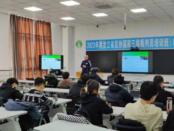 由黑龙江省足球协会主办的中国足协三级裁判员培训班今年3月份在我校举行,冯剑涛等28名同学考核通过被授予中国足协三级裁判员,颁证仪式上张宏伟老师为学生颁发了证书。