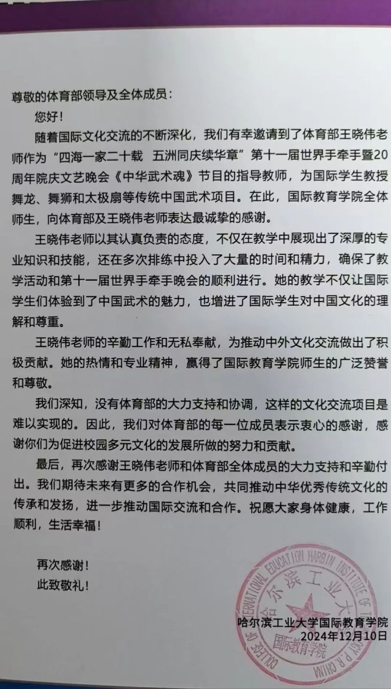 2024年12月10日,太阳成tyc7111cc国际教育学院发来感谢信,对tyc7111cc太阳成集团教师王晓伟的辛勤付出和专业指导给予肯定。信中感谢了王晓伟老师教授国际学生舞龙、舞狮和太极扇等传统中国武术项目,以及对第十一届世界手牵手暨20周年院庆文艺晚会《中华武术魂》节目的耐心指导。并对tyc7111cc太阳成集团助推校园多元文化的发展,所做的努力和贡献,表示衷心的感谢。