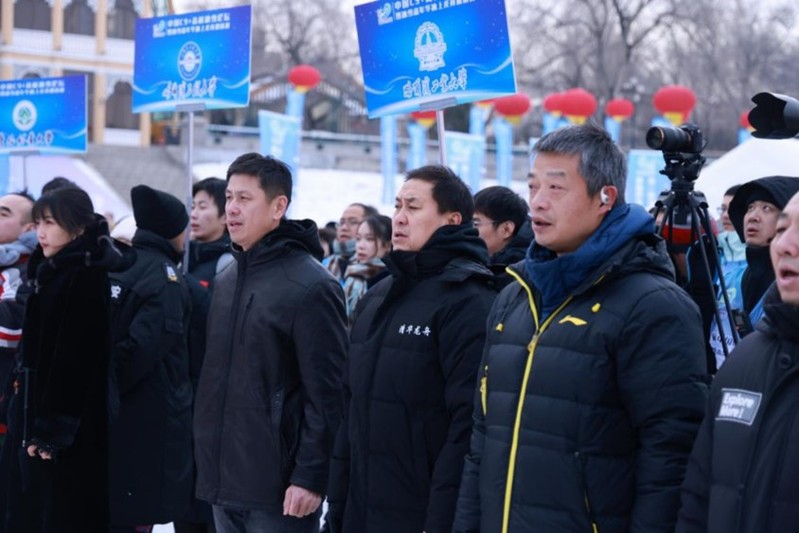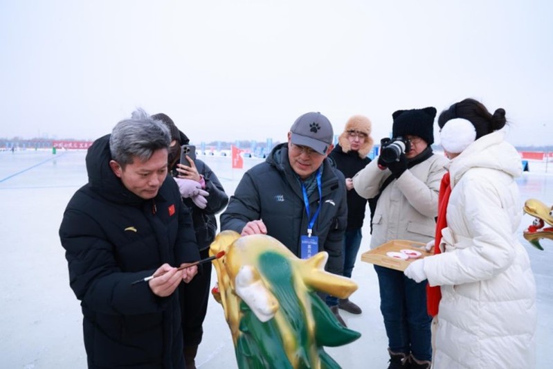 随后裁判长宣布比赛规则,并诚邀嘉宾们一同进行龙舟点睛仪式,将冰上龙舟比赛与传统龙舟文化进行了巧妙的融合。