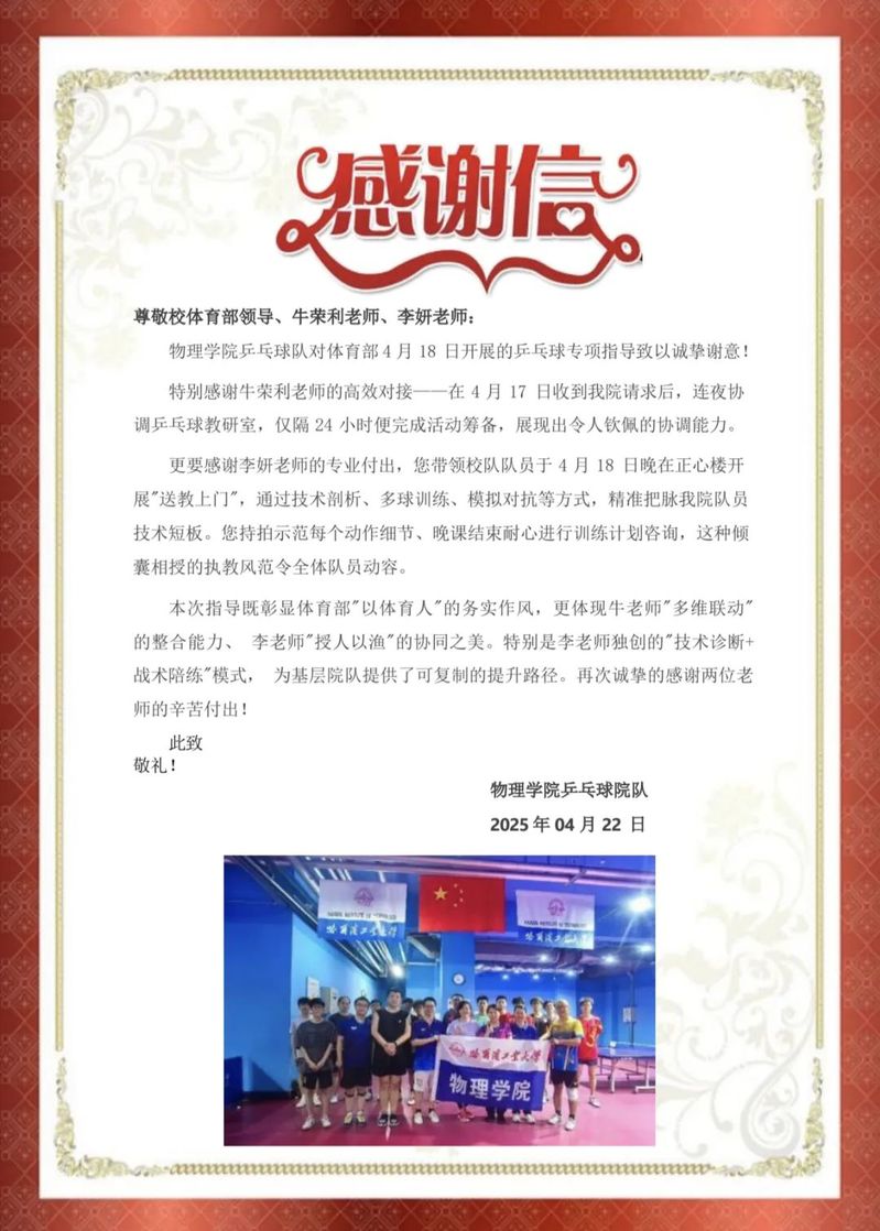 近日,太阳成tyc7111cc物理学院发来感谢信。信中物理学院乒乓球队全体成员向tyc7111cc太阳成集团领导及牛荣利老师、李妍老师致以衷心感谢,高度赞誉其高效协作与专业奉献精神。