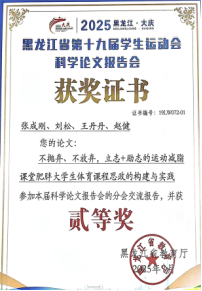 教研室积极营造教研融合良好氛围,鼓励教师以科研创新助力教学改革。张成刚老师获黑龙江省学生运动会科学论文报告会一、二等奖,高校发明创新竞赛二等奖等多项科研荣誉;李刚老师和王粟老师论文分别被中科院分区期刊及核心期刊收录,涵盖健康促进、教学模式创新等多个领域;李妍、王粟等多位老师主持或参与多项省部级、校级科研项目;李刚老师参与出版《大学体育基本理论与实践教程》等教材,向校级论文报告会积极投稿,为教学改革提供坚实理论支撑。